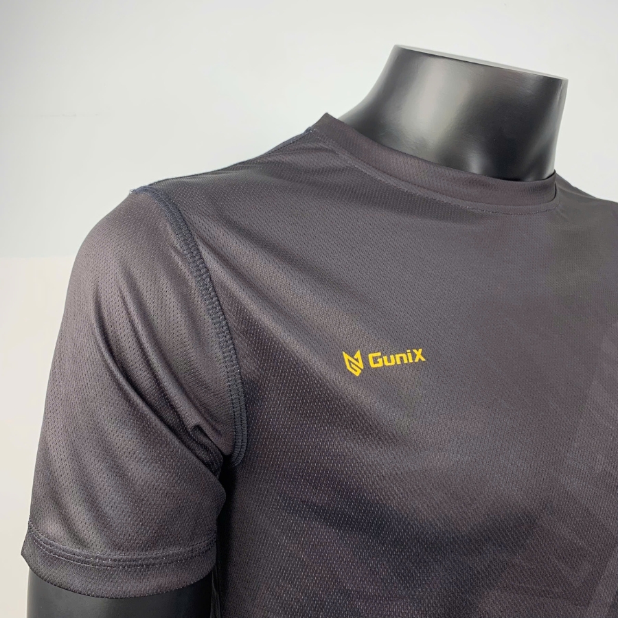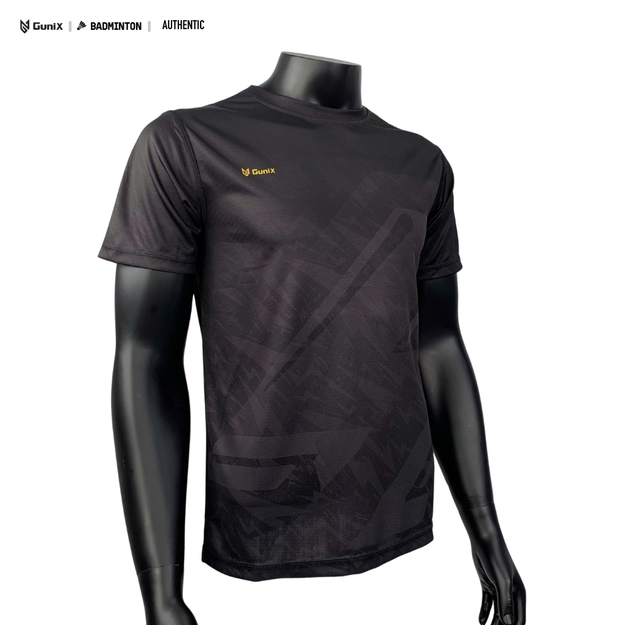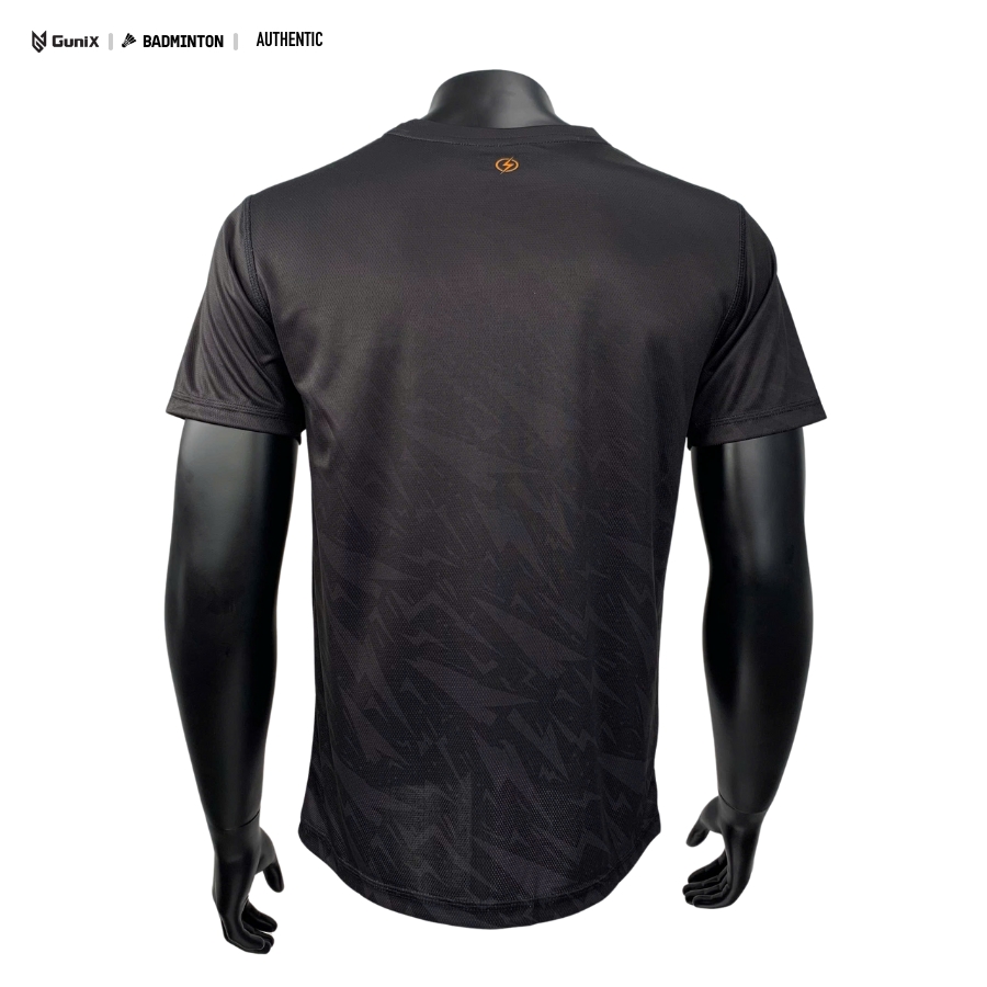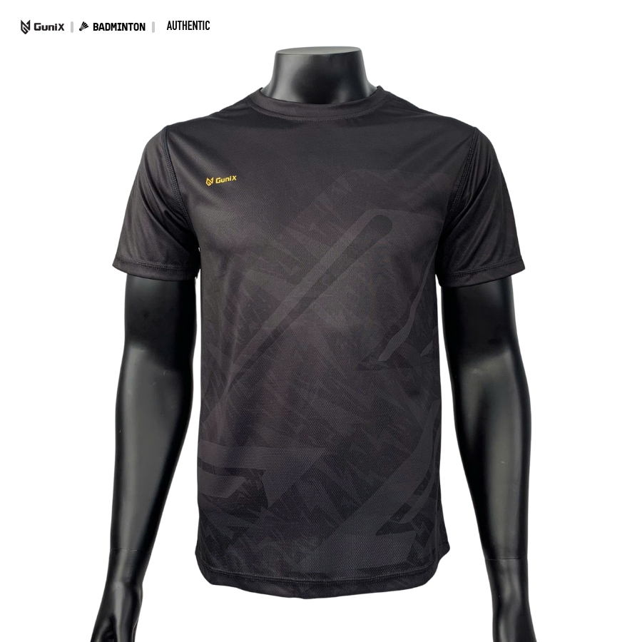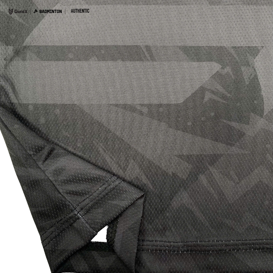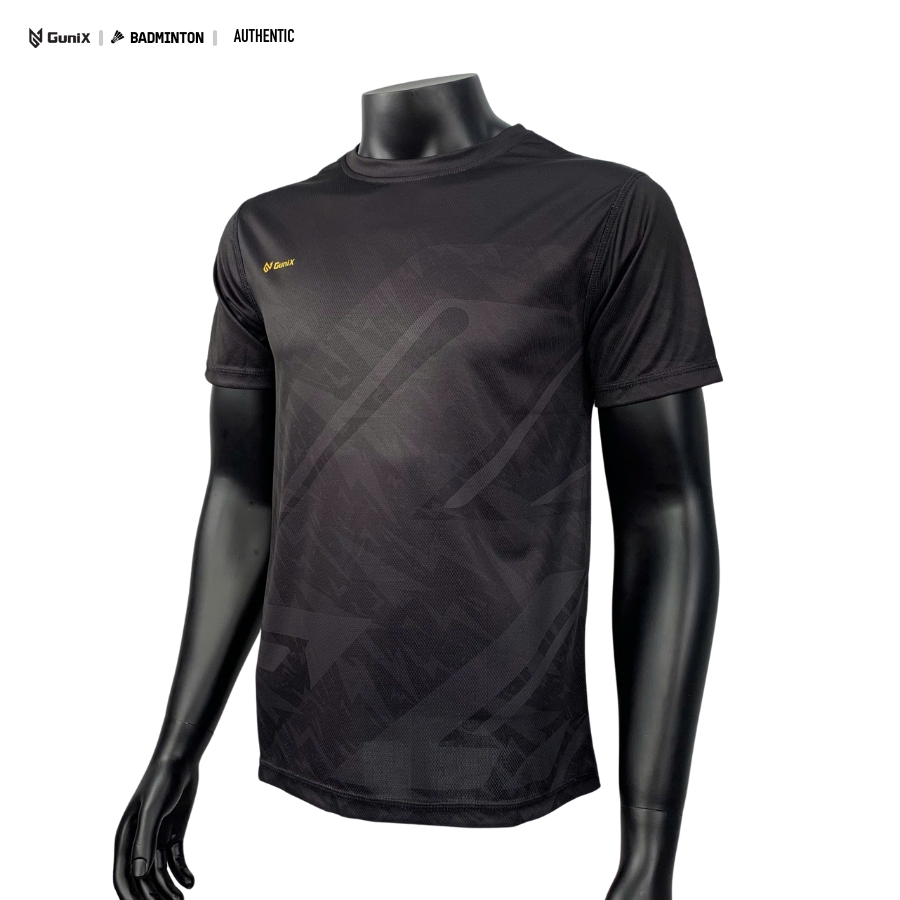 Áo màu đen phối họa tiết xám, tạo hiệu ứng chuyển màu sắc nét, đậm chất thể thao và nam tính.