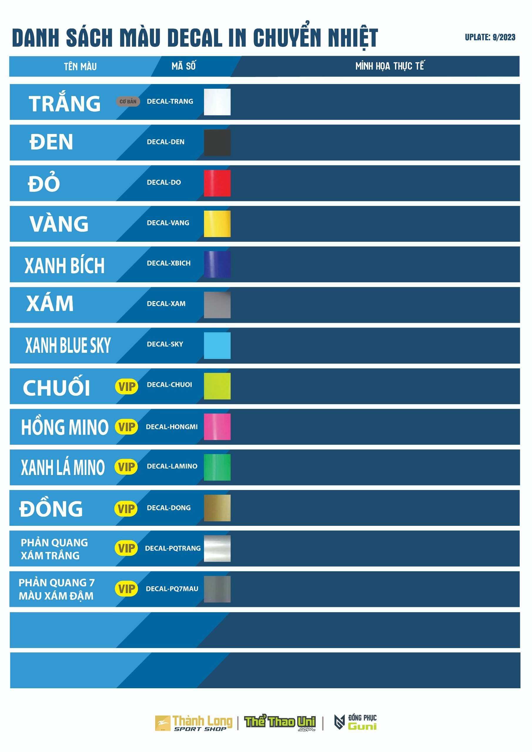 - In Decal Chuyển Nhiệt: là giải pháp tuyệt hảo dùng cho việc in ấn chuyển nhiệt lên áo hay chất liệu vải tối màu được sử dụng phổ biến với công nghệ in chuyển nhiệt để ép số, ép tên cầu thủ. Decal In Áo tại Uni Sport đa dạng về màu sắc cho bạn lựa chọn, sản phẩm in ra có độ sắc nét cao, dễ sử dụng. In Decal Áo Đá Bóng được ưa chuộng rộng rãi trong lĩnh vực in ấn áo cầu thủ, thời trang thể thao hay áo pull thông thường.