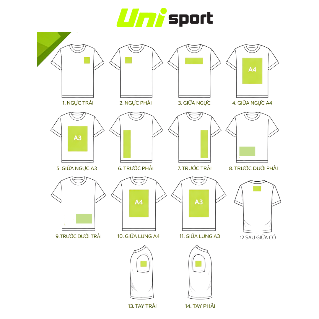 In áo không chỉ là đưa hình lên vải — mà là định vị thiết kế một cách chuyên nghiệp, sao cho thu hút, dễ nhìn và đảm bảo tính đồng nhất. Chọn sai vị trí hoặc kích thước in không hợp lý có thể khiến sản phẩm trông “méo” hoặc mất cân đối. Uni Sport sẽ giúp bạn khám phá những vị trí in đẹp nhất và kích thước chuẩn để giúp thiết kế của bạn trở nên hoàn hảo!